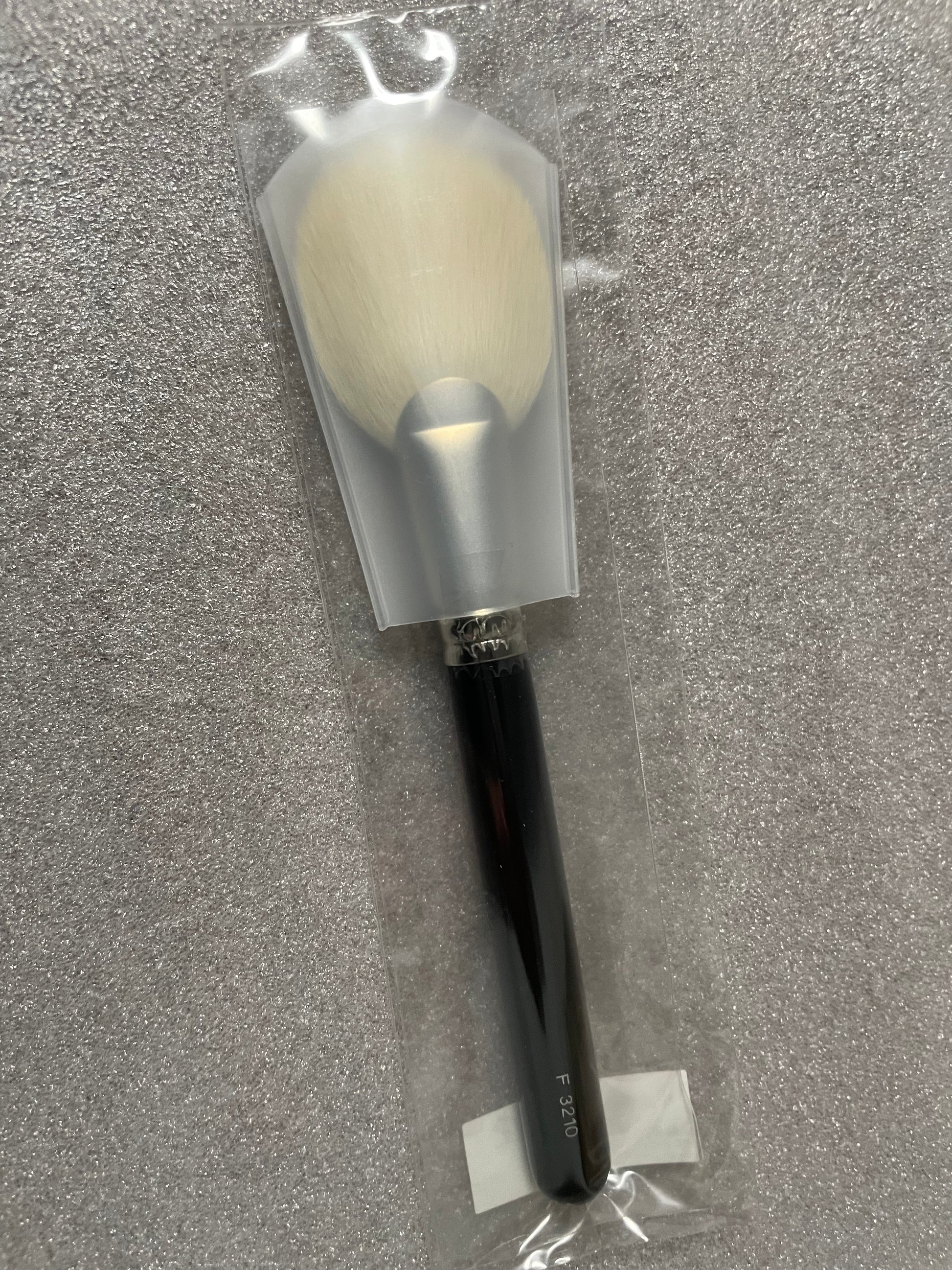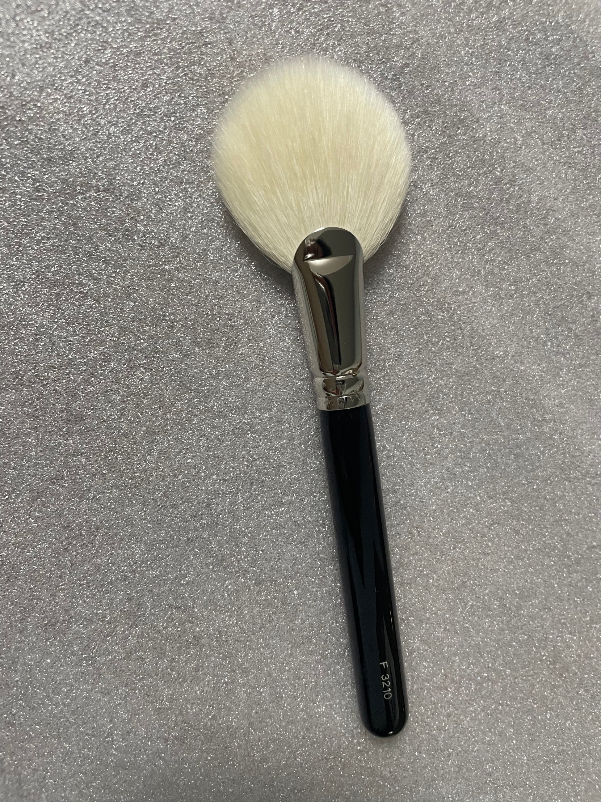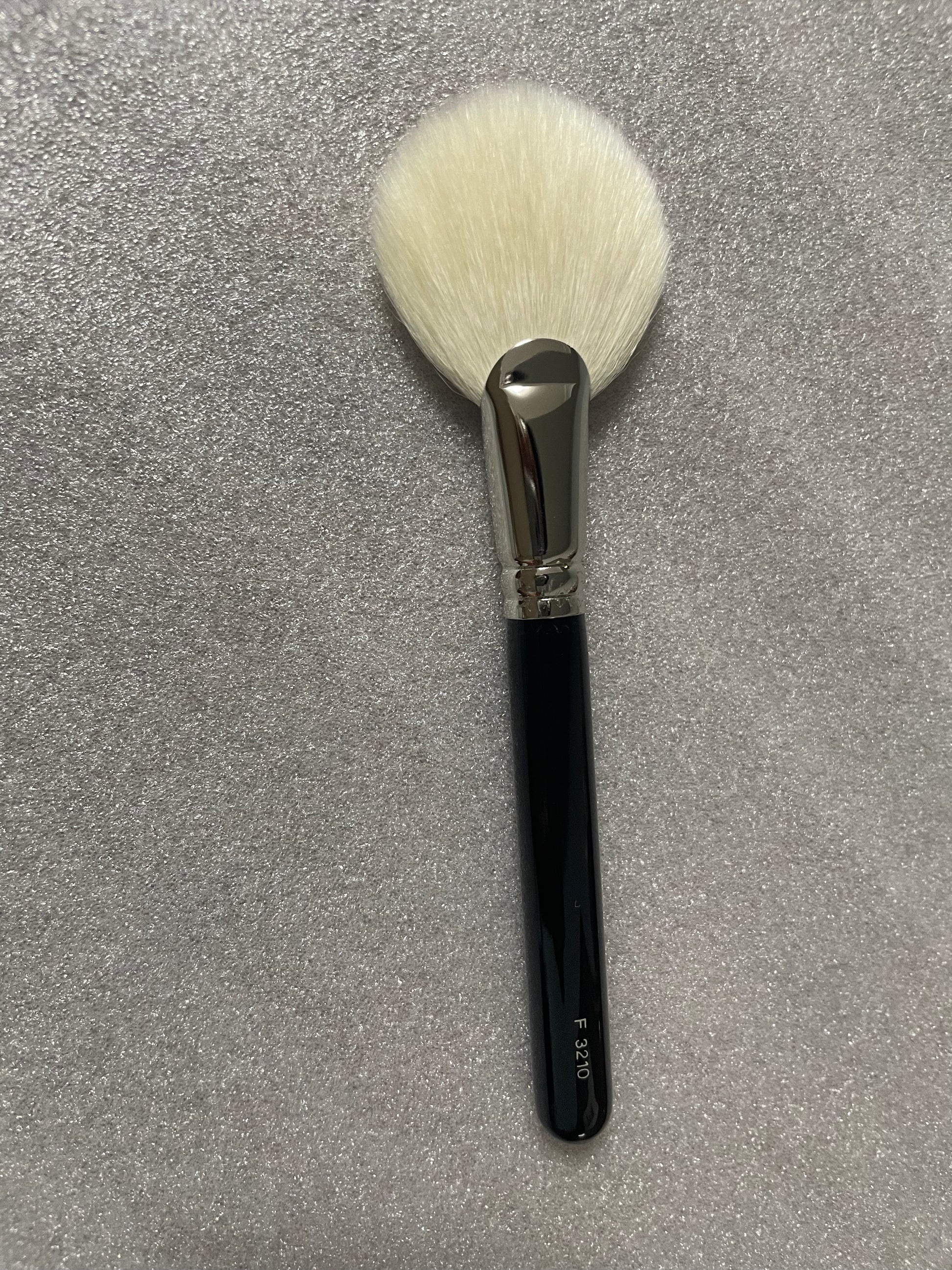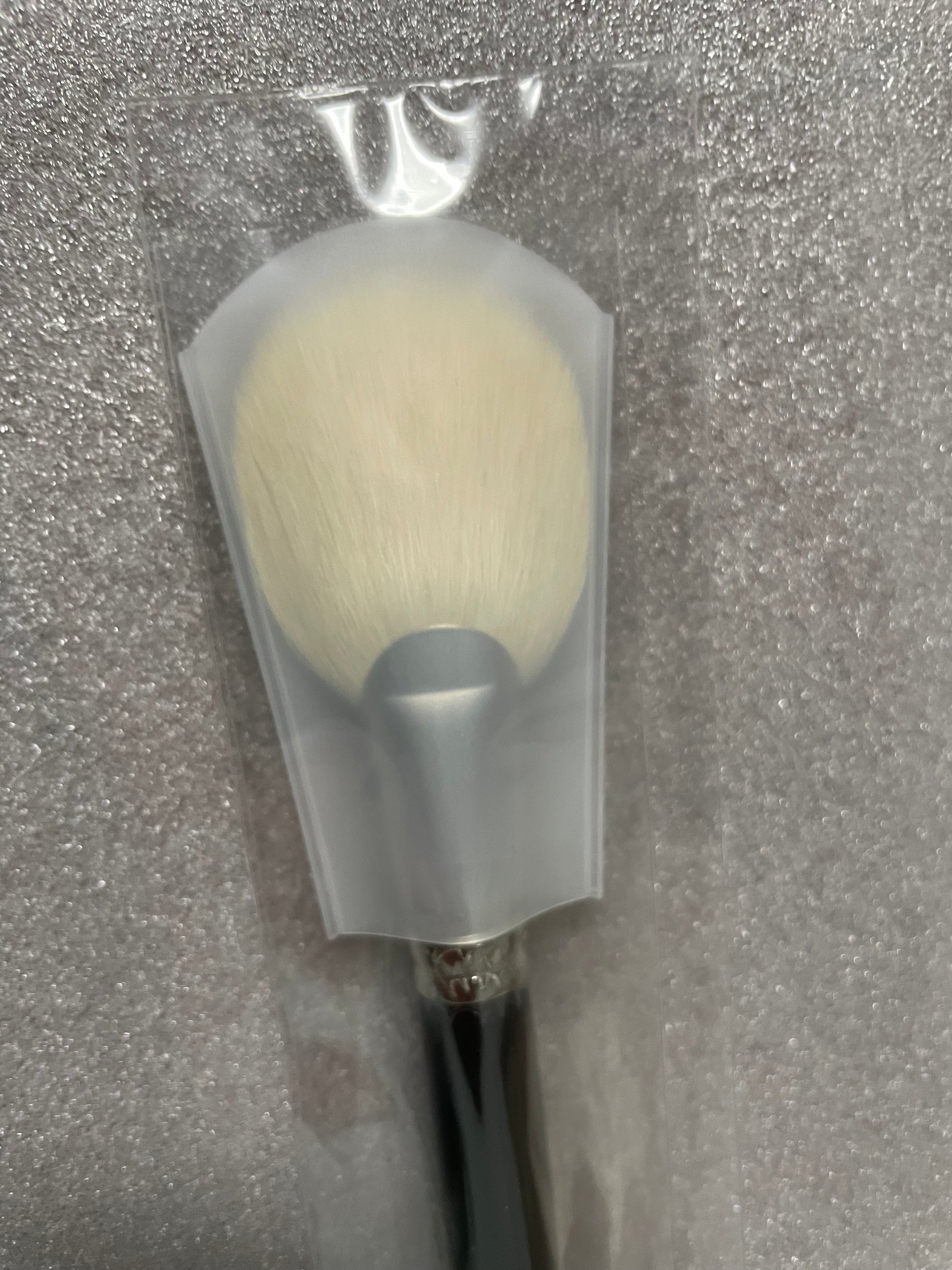 A wide and round fan shaped powder brush. The hair tips are arranged all over the brush face so you can swiftly apply an even layer of powder.