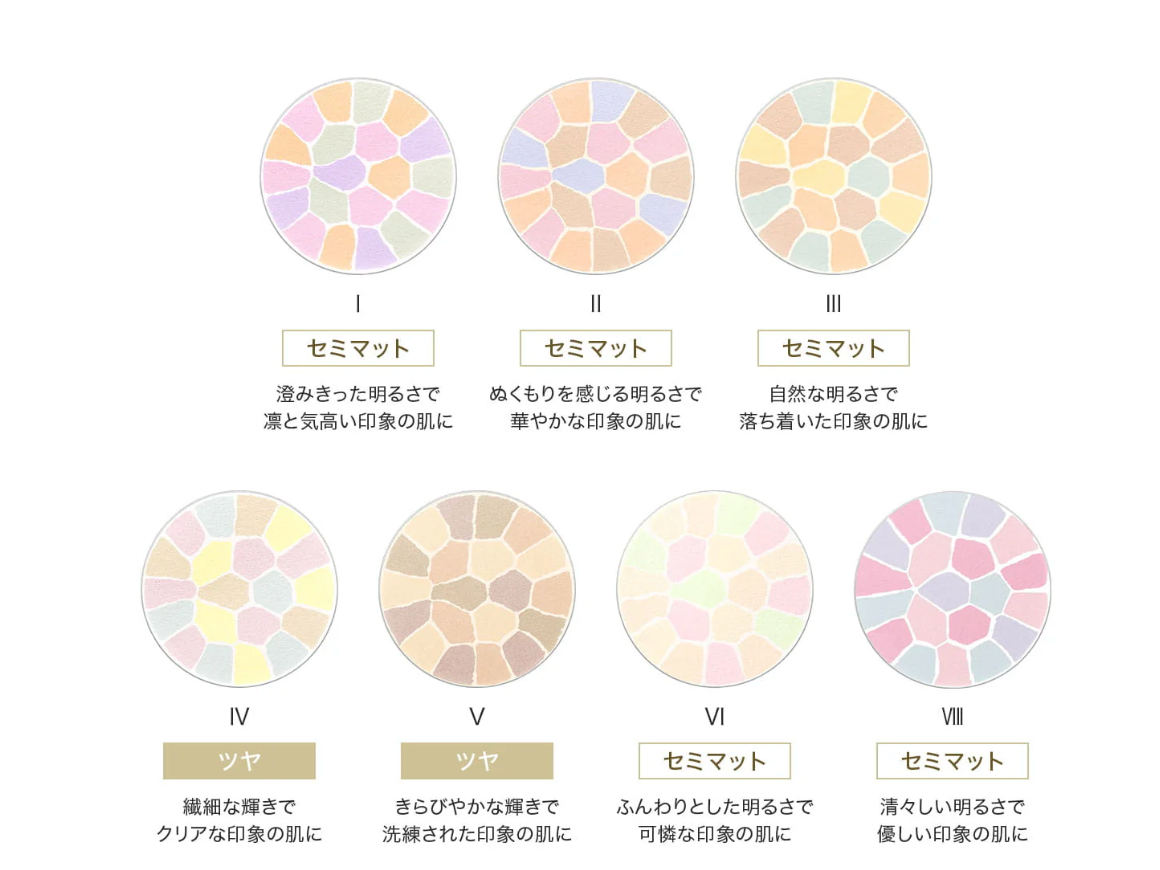 "A finishing face powder that provides a silky, luxurious feel and imparts translucence to the skin. The assortment of colorful pastel-toned powders enhances the foundation's texture while giving the skin a translucent impression, a refined texture, and a soft, airy brightness.