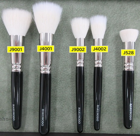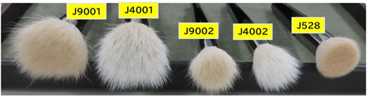 The J4001 and J4002 have longer hair lengths compared to the J9001 and J9002, and because their tips are synthetic fibers, the powder application will be lighter.